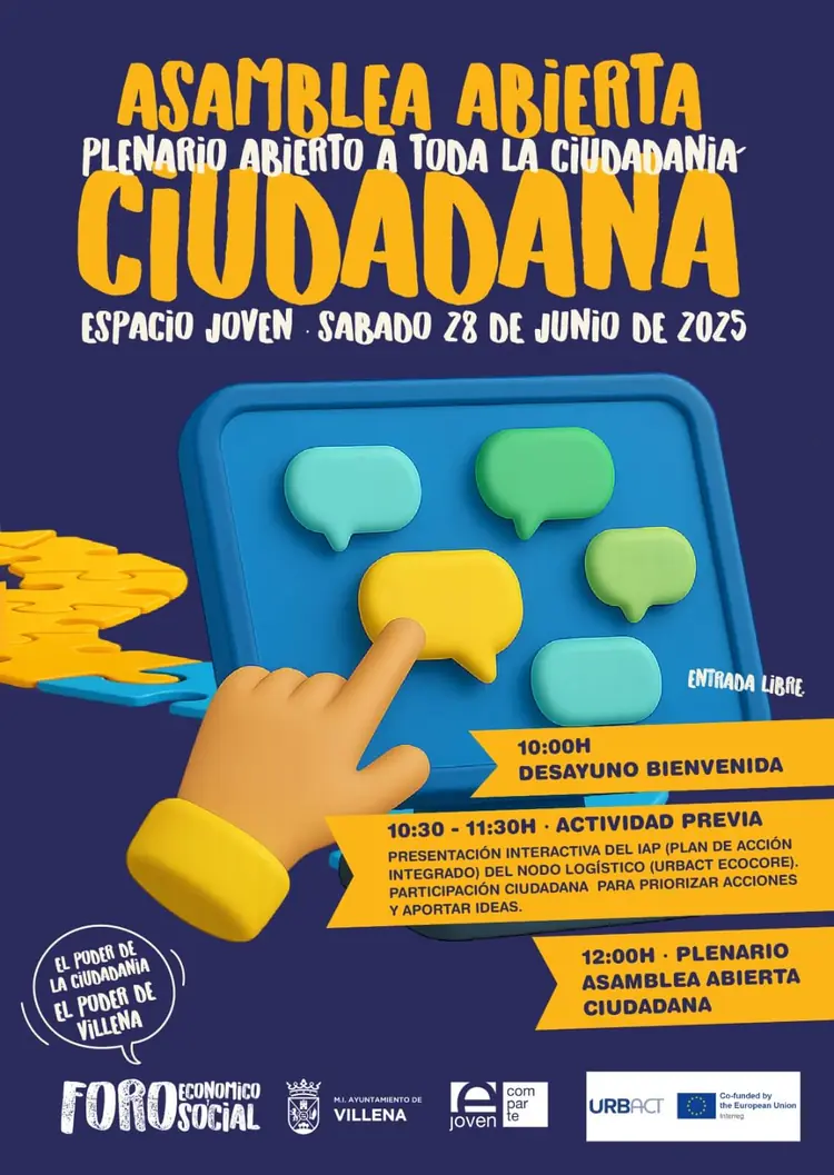 El Foro Económico y Social de Villena reunirá a vecinos y vecinas en una Asamblea Ciudadana abierta el próximo sábado 29 de noviembre de 2025 en el Espacio Joven. Tal y como ha comentado la representante del Foro, Virtu Ribera, la jornada consta de dos partes. En la primera de ellas se darán cuenta